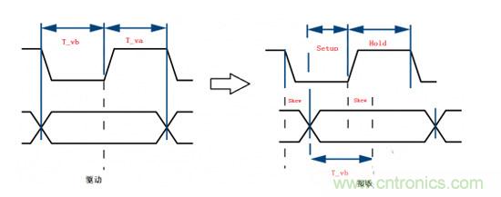上圖中,T_vb與T_va表示的是主控芯片在輸出數(shù)據時時鐘與數(shù)據之間的時序參數(shù)。在理想情況下,時鐘邊沿和數(shù)據電平的中心是對齊的,由于時鐘和數(shù)據傳輸通道不等長,使得時鐘邊沿沒有和數(shù)據脈沖的中間位置對其,使得建立時間的裕量變小。在理解了這些基礎問題之后,我們需要做的就是將這些時間參數(shù)轉化為線長。