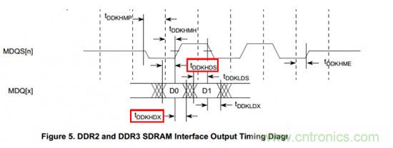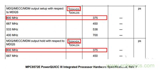 下面我們通過具體實例來看看時序的計算,下圖是Freescale MPC8572 DDR主控芯片手冊,這張圖片定義了從芯片出來的時候,DQS與DQ之間的相位關系。