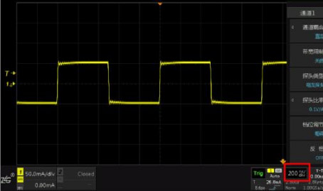 如圖4所示,在測試100KHz的電流方波時,探頭的方波響應是很好的,波形基本上沒有畸變,波形比較平坦,沒有發(fā)生傾斜等。