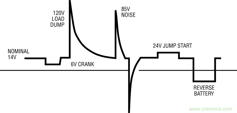 交通運輸系統(tǒng)的輸入電壓可能高達 14V (單電池供電汽車)、28V (雙電池供電卡車、客車和飛機)、或更高電壓,而其數(shù)字系統(tǒng)需要一個或更多個低壓軌。因此,設(shè)計這類系統(tǒng)時,需要了解怎樣才能簡便、高效和可靠地從很高的輸入電壓降壓。以下圖 1 顯示,汽車環(huán)境中的輸入電壓可能視其運行狀態(tài)的改變而改變,而其運行狀態(tài)可能包括負載突降變化到冷車發(fā)動的各種情況,甚至出現(xiàn)電池反向連接。