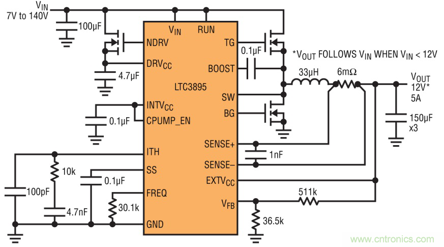 由于在單電池或雙電池供電車輛中,冷車發(fā)動和負載突降情況很常見,所以很多交通運輸系統(tǒng)都提供很寬的輸入電壓范圍。而且使情況更加復雜的是,所需輸出電壓有可能超出這種已經(jīng)很寬的輸入電壓范圍。因此,系統(tǒng)設(shè)計師面臨的復雜問題是,無論輸入電壓是高于、低于還是等于輸出電壓,所設(shè)計的解決方案都必須允許固定輸出。
