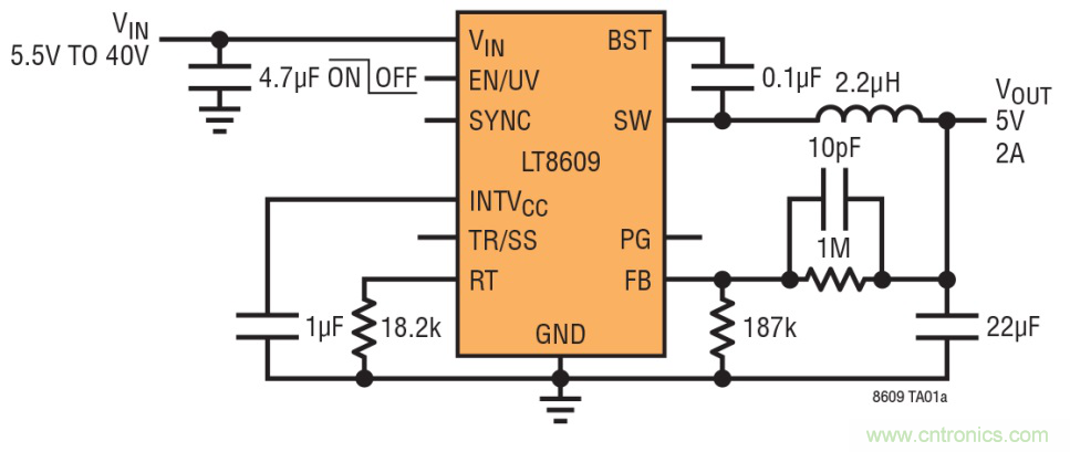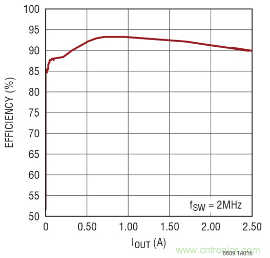 一個很好的例子是 LT8609,這是一款 2A、42V 輸入同步降壓型開關(guān)穩(wěn)壓器。獨特的同步整流拓撲提供 93% 的效率,而以 2MHz 頻率切換使設(shè)計師能夠避開關(guān)鍵噪聲敏感頻段,例如 AM 無線電,同時可提供占板面積非常緊湊的解決方案。突發(fā)模式 (Burst Mode®) 運行在無負載備用情況下保持靜態(tài)電流低于 2.5μA,從而使該器件非常適合始終保持接通的系統(tǒng)。LT8609 的 3.0V 至 42V 輸入電壓范圍使其非常適合汽車應用,這類應用必須以低至 3.0V 的最低輸入電壓穩(wěn)定通過冷車發(fā)動和停-啟情況,并穩(wěn)定通過超過 40V 的負載瞬態(tài)。其內(nèi)部 3.5A 開關(guān)可在峰值負載電流為 3A 時,提供高達 2A 的連續(xù)輸出電流。原理圖和相應于 2MHz 切換頻率的效率曲線如圖 3 所示。