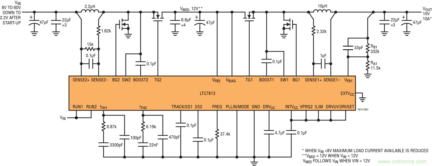 解決汽車冷車發(fā)動問題的另一種方法是,采用升壓型轉(zhuǎn)換器,后面再跟一個降壓型轉(zhuǎn)換器。在這種拓撲中,從單電池提供的升壓型轉(zhuǎn)換器之輸出設(shè)定為比電池的標稱電壓高出幾伏,然后再用一個降壓型轉(zhuǎn)換器對其降壓,使其達到下游電子組件所需的工作電壓。盡管這種方法需要兩個轉(zhuǎn)換器,但是ADI公司已經(jīng)開發(fā)出一款整合了升壓型控制器和降壓型控制器的器件,兩個控制器既可獨立使用,又可作為升壓-降壓跟隨器使用。圖 5 中用LTC7813 說明這種器件的工作原理。