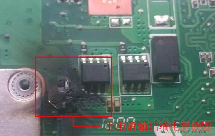較于上一種電源模塊損壞的情況而言,更可怕的情況就是,不僅壞了電源甚至把整個電路都燒毀了。具體的現(xiàn)象就是電源模塊剛上電就燒毀冒煙了,輸入端的電容炸裂,如圖3所示,這一類問題是最為嚴(yán)重的,需要在前期設(shè)計中盡量避免,那么若是已經(jīng)發(fā)生了這一情況,它到底是什么原因?qū)е碌哪??具體如下所示:
