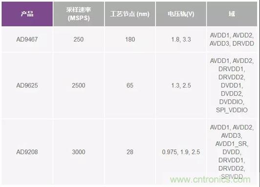 數(shù)字電路不需要裕量,因?yàn)樽钪匾膮?shù)是速度。所以,數(shù)字電路通常以最低電源電壓運(yùn)行,以獲取CMOS開(kāi)關(guān)速度和功耗的優(yōu)勢(shì)。這在新一代ADC中很明顯,最低電壓軌已降低至0.975 V。下面的表1列出了若干代的一些常見(jiàn)ADC。