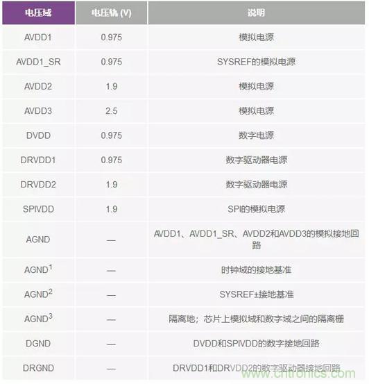 為了改善隔離,設(shè)計(jì)者必須考慮各種耦合機(jī)制。最明顯的機(jī)制是通過(guò)共享電源域。如果電源域盡可能遠(yuǎn)離電路,那么共享同一電壓軌(AD9208為0.975 V)的數(shù)字電路和模擬電路發(fā)生震顫的可能性將非常小。在硅片中,電源已被分開(kāi),接地也是如此。封裝設(shè)計(jì)繼續(xù)貫徹了這種隔離電源域處理。由此所得的同一封裝內(nèi)不同電源域和地的劃分,如表2所示,其以AD9208為例。