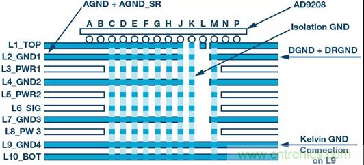 通過(guò)充分濾波和布局分離,各個(gè)域可以合理布置,使得ADC性能最大化,同時(shí)降低BOM和PDN復(fù)雜性。各接地域采用開(kāi)爾文連接方法也會(huì)改善隔離。從網(wǎng)表角度來(lái)看,仍然只有一個(gè)GND網(wǎng)。電路板可以劃分為不同接地域以提供充分的隔離。在AD9208的評(píng)估板AD9208-3000EBZ中,不同接地分區(qū)在第9層上形成開(kāi)爾文連接。圖4所示為10層PCB(印刷電路板)AD9208-3000EBZ的橫截面,其顯示了不同GND連接。