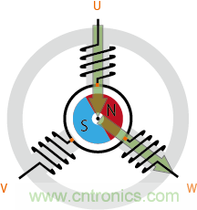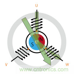 圖3:轉(zhuǎn)子的永久磁石會像被合成磁通量牽引一樣旋轉(zhuǎn),電機的軸也會因此旋轉(zhuǎn)