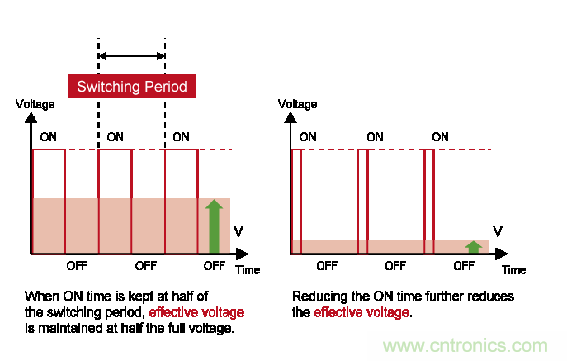 ON時間越長,有效值越接近施加100%電壓時(ON時)的電壓