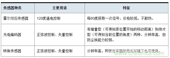 表1中顯示的是BLDC電機主要的位置檢測用傳感器的種類。根據(jù)控制方式的不同,需要的傳感器也是不同的。在120度通電控制中,為判斷要對哪個相通電,配備了可每60度輸入一次信號的霍爾效應(yīng)傳感器。另一方面,對于精密控制合成磁通量的“矢量控制”(在下一項中說明)來說,轉(zhuǎn)角傳感器或光電編碼器等高精度傳感器較為有效。