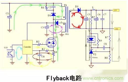 ●Y電容的連接點,講究一個“靜”,很顯然上圖Y電容最佳連接點事C1的負端,以及變壓器T1的次級7腳。