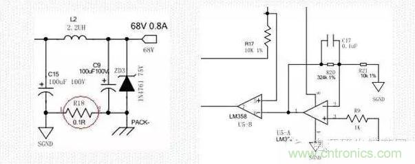 工作原理:R18為回路的電流檢測電阻,為了降低損耗,此電阻選擇時盡量的小。U5為運(yùn)算放大器LM358,358內(nèi)部由兩個運(yùn)放,我們將兩個運(yùn)放一個做放大器,一個做比較器,將檢測電阻上的電壓值放大32.4倍后與基準(zhǔn)電壓做比較。當(dāng)運(yùn)放值低于基準(zhǔn)值時,比較器輸出高電平(358VCC電壓),當(dāng)運(yùn)放值高于基準(zhǔn)電壓值時,比較器輸出低電平(相對于接地).