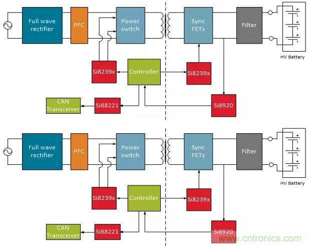 OBC系統(tǒng)采用交流輸入源,通過全波整流器將其轉換為高壓直流總線電壓,并提供功率因數(shù)校正(PFC)。產(chǎn)生的直流信號被斬波成開關方波,用于驅動變壓器以產(chǎn)生所需的直流輸出電壓。輸入信號的斬波由隔離柵極驅動器(例如Silicon Labs的Si8239x器件)完成。