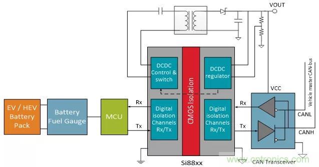 如圖3所示,這個簡化的BMS系統(tǒng)展示了在與一個EV子系統(tǒng)進行連接時信號和電源隔離的重要性。在大多數(shù)EV子系統(tǒng)中,CAN總線通過數(shù)字隔離與該子系統(tǒng)中的高壓隔離。現(xiàn)代數(shù)字隔離兩側各需要一個電源為隔離器供電(高壓域和低壓域)。該電源也可為連接到隔離器的其他設備供電,例如CAN總線收發(fā)器。