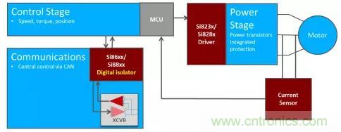 這些系統(tǒng)需要在馬達控制器和功率晶體管之間采用隔離驅動器。隔離允許低壓控制器安全地開關高功率晶體管以產(chǎn)生交流波形。此外,馬達控制系統(tǒng)中可能存在隔離的CAN總線,并且有某些方法可以感測驅動馬達的電流,以監(jiān)控速度和轉矩。圖4展示了一個使用一系列數(shù)字隔離設備的簡化的牽引馬達控制系統(tǒng)。
