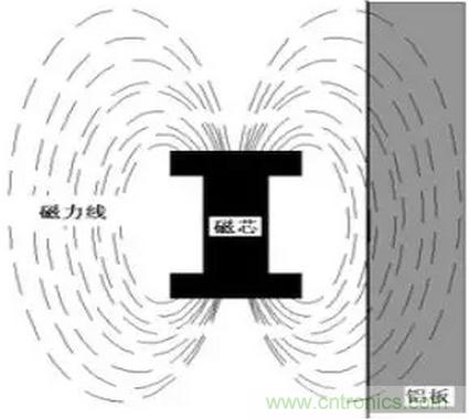 當(dāng)在一個工字電感旁邊放置鋁板時(shí)。如圖2所示,由于鋁板屬于逆磁性材料,其磁阻很大。相當(dāng)加鋁板時(shí),原先的磁通面積減小。