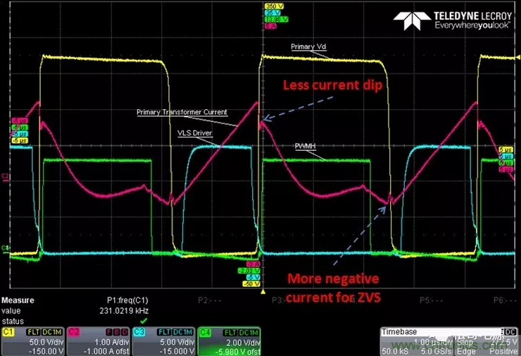 (2)、GaN的Coss 及Qoss非常小,要求實(shí)現(xiàn)ZVS開通所需要的激磁電流小,這樣就減小系統(tǒng)的環(huán)流,從而降低在功率MOSFET和變壓器中產(chǎn)生的導(dǎo)通損耗,同時(shí)也可以減小變壓器磁芯的損耗。