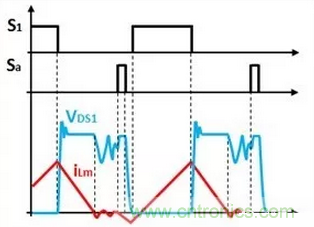 在主開關(guān)管開通前,先開通輔助繞組的開關(guān)管,輔助電源對(duì)輔助繞組進(jìn)行電流反灌,將能量?jī)?chǔ)存在變壓器中;輔助繞組的開關(guān)管關(guān)斷后,變壓器儲(chǔ)存的能量抽取主開關(guān)管COSS的能量,COSS放電電壓降低,直到其內(nèi)部體二極管導(dǎo)通,這時(shí)候開通主開關(guān)管,就能實(shí)現(xiàn)零電壓開通ZVS。