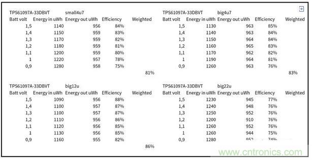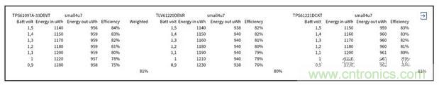 Otii工具讓效率計算變得非常簡單,只需將輸出能量除以輸入能量即可,然后根據(jù)案例一測量設(shè)置中的說明對該效率值進行加權(quán)。圖5為所有三個DC/DC轉(zhuǎn)換器提供了一個概覽。