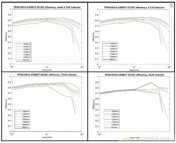 在本文件分析所采用的簡單系統(tǒng)中,三種TI DC/DC轉(zhuǎn)換器的性能非常相似;之所以選擇TPS61097A-33DBVT,只是因為它采用了SOT23-5封裝。關(guān)于電感器選擇,應(yīng)選擇12μH電感器,因為它具有更高的效率,并且有足夠的空間來使用它。