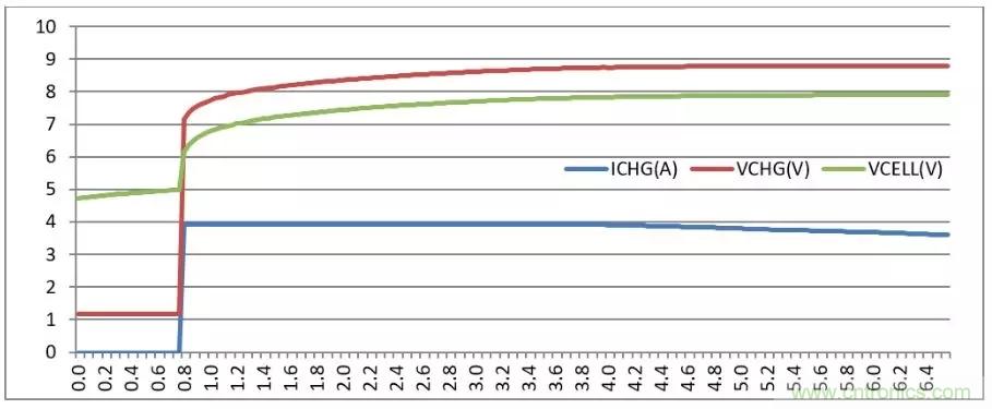 基于這個(gè)管理過程,使用充電芯片BQ24725A對一塊對講機(jī)電池(滿充電壓8.8V)進(jìn)行充電,并記錄下充電過程中的VCHG, ICHG和VCELL(電芯側(cè)的電壓)。下圖所示為基于橫坐標(biāo)的充電時(shí)間(分鐘)對應(yīng)的各個(gè)參數(shù)的變化趨勢,可以看到在不到第五分鐘,VCHG就達(dá)到最大值,ICHG就從峰值的4A電流開始下降,經(jīng)歷了從CC區(qū)間到CV區(qū)間的切換。最大充電速率的CC階段4A充電持續(xù)時(shí)間很短,可以預(yù)料,如果要對這塊電池完全充滿,CV區(qū)間將耗費(fèi)很長的時(shí)間。