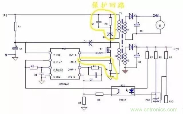 3)保護回路:PC1芯片本身和3腳外圍元件R4構成過電流保護回路;N1繞組上并聯(lián)的D2,R6,C4元件構成了開關管的反壓吸收保護電路;實質(zhì)上穩(wěn)壓回路的電壓反饋信號——穩(wěn)壓信號,也可看作一路電壓保護信號,但保護電路的內(nèi)容并不僅是局限于保護電路本身,保護電路的啟控往往是由于負載電路異常所引起的。