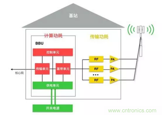 據(jù)專業(yè)人士分析,部署初期,5G網(wǎng)絡主要采用CU和DU合設+AAU的設備方案,即在基站側采用BBU+AAU單元的建設模式。其中,BBU單元安裝在機房或室外機柜內,集成RRU和大規(guī)模天線陣列功能的AAU單元安裝在室外天面。由于5G采用MIMO技術,BBU功耗將比現(xiàn)網(wǎng)4G系統(tǒng)的BBU功耗增加2倍,AAU功耗將比現(xiàn)網(wǎng)4G系統(tǒng)的AAU功耗增加2-3倍。