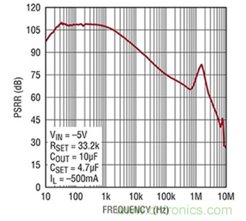 圖2:該圖顯示高性能LDO的PSRR頻率響應(yīng):在1kHz時,良好LDO的基準值介于60dB至110dB之間。(圖片來源:Analog Devices)
