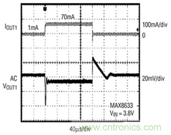 圖3:對輸出負載快速變化的瞬態(tài)電壓響應(yīng)是無線傳感器應(yīng)用的LDO關(guān)鍵性能指標。此處所示為高性能LDO的響應(yīng)。(圖片來源:Maxim Integrated)