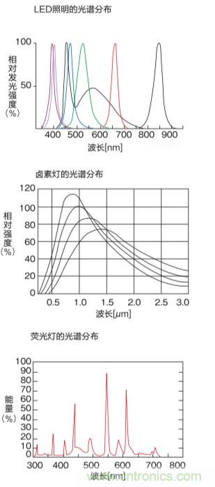 當(dāng)然就算你的響應(yīng)速度再快、消耗電流更小、壽命更長(zhǎng)但如果光譜分布不好也是有問(wèn)題的,所以下面我們看一下LED的顏色光譜分布情況。首先要說(shuō)明LED照明的光譜分布不像熒光燈、鹵素?zé)裟菢硬ㄩL(zhǎng)分布較寬,每個(gè)LED照明發(fā)光波長(zhǎng)可謂某個(gè)固定的特定波長(zhǎng)。
