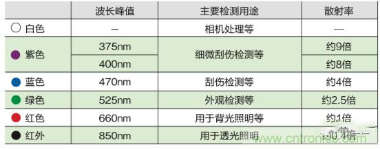 比紅光的散射率作為基準(zhǔn)單位,各波長(zhǎng)相對(duì)于紅光的散射率比值。波長(zhǎng)越短散射率越高。使用散射率較高的波長(zhǎng)時(shí),便于捕獲檢測(cè)物體表面的散射光,有效檢測(cè)散射光反映出的表面特征。反之,波長(zhǎng)變長(zhǎng)時(shí)透光率也隨著增大,特別是紅外光照明,常用于背光光源檢測(cè)透過(guò)檢測(cè)物體的折射光。