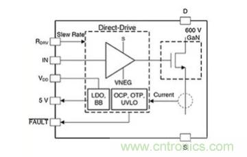 eGaN 價格降低使芯片制造商能夠解決這兩個問題。例如,Texas Instruments 在其 LMG3411R070 的集成柵極驅(qū)動中集成了70 毫歐姆 (mΩ)、600 伏 eGaN 功率級(圖 2)。