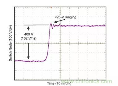 該芯片的壓擺率可達 100 伏/納秒 (ns) 且瞬時振蕩近乎為零(圖 3)。相比之下,傳統(tǒng)硅功率 MOSFET 的壓擺率典型值為 3 至10 V/ns。