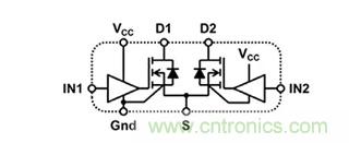 圖5:EPC 的 eGaN 集成驅(qū)動器 IC 包含兩個功率晶體管,各配有相應的優(yōu)化型柵極驅(qū)動器。(圖片來源:EPC)