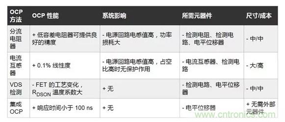 一種傳統(tǒng)的 OCP 方法是使用電流互感器、分流電阻器或去飽和檢測電路(如下表)。然而,這會增大電源回路的寄生電感和電阻,反而需要降低壓擺率,且導致功率耗散升高,從而對系統(tǒng)性能產(chǎn)生不利影響。此外,互感器或分流電阻器等分立器件會增加成本,占用電路板空間。