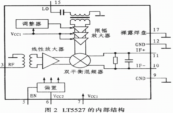 LT5527由高線性雙平衡混頻器、RF緩沖放大器、高速限幅LO緩沖器及偏置/使能電路構(gòu)成,RF和L0輸入以單端方式工作,IF輸出是差分輸出,低端LO和高端LO注入均可用。LT5527的外引腳排列如圖1所示,內(nèi)部結(jié)構(gòu)如圖2所示,各引腳的功能如下所述。