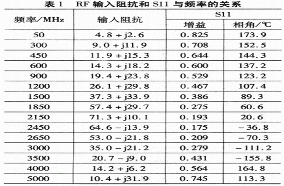 在400 MHz低頻處或3.7GHz處,RF輸入匹配網(wǎng)絡(luò)在原有基礎(chǔ)上增加并聯(lián)電容器C5,如果450MHz下的輸入匹配電容器C5的容值為12 pF,在評估板的50 Ω輸入傳輸線上,位于距離引腳34.5 mm的位置;900 MHz下的輸入匹配電容C5=3.9 pF,位于距離引腳3 1.3 mm的位置;3.5 GHz下的輸入匹配電容器C5=O.5 pF,位于距離引腳34.5mm的位置。這種串聯(lián)傳輸線/并聯(lián)電容器匹配拓撲使得LT5527可用于倍頻標準,而不需要修正電路板的設(shè)計。串聯(lián)傳輸線可用串聯(lián)的片式電感器代替,以使布局更簡單。RF輸入阻抗和Sl1與頻率的關(guān)系(沒有外部匹配)列于表1。S11數(shù)據(jù)用于微波電路模擬設(shè)計自定義匹配網(wǎng)絡(luò),模擬和RF輸入濾波器的接口連接。