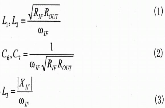 在許多應(yīng)用中,可以用離散IF不平衡變壓器代替IF變壓器,如圖4所示。Ll、L2、C6和C7的值可用式(1)、式(2)計算,在IF頻率期望值上得到 180°相移,并提供50Ω的單端輸出。電感器L3的值也可計算,但L3抵消內(nèi)部2.5pF的電容器,L3也為IF+端提供偏置電壓。低功耗多層片式電感適合Ll、L2,為了得到最大轉(zhuǎn)換增益以及為IF+端提供最小DC電壓,L3選用高Q值線繞片式電感器,C3是DC的隔離電容器。