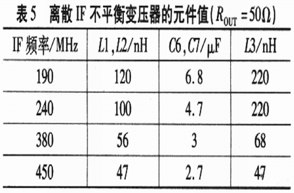 通用IF頻率下離散IF不平衡變壓器的元件值如表5所示。由于電路板和寄生效應(yīng)的影響,表5中的值與計算值略有差別。