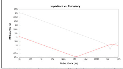 圖1.放大器的電源線(xiàn)會(huì)拾取RF信號(hào)。圖中數(shù)據(jù)表明1μF電容的對(duì)地阻抗低于10pF的阻抗,提供更好的噪音抑制能力