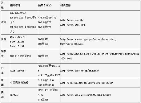 SRD無線系統(tǒng)的設(shè)計者在選擇無線通信頻率上需要格外小心。在大多數(shù)的情況下,此選擇被侷限于頻譜中容許免執(zhí)照使用的那些部份,而前提是必須符合使用上的特定規(guī)格與條件。表一所列為全球可使用的頻帶。