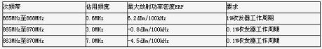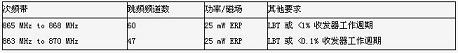 如表三所示,為使用FHSS時,歐洲的擴(kuò)展頻帶上(低于870MHz)所需要的頻道數(shù)量、有效發(fā)射功率(ERP)、及工作週期。當(dāng)符合"說前先聽(listen-before-talk,LBT)"或是工作週期有效率限制值時,便可有高達(dá)7MHz的頻寬可供使用,以往則只有2MHz的范圍。