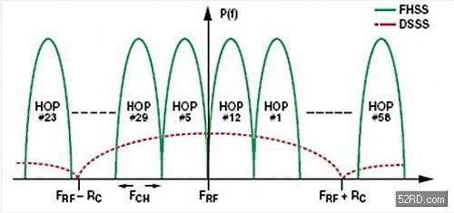 跳頻展頻(FHSS)發(fā)射技術(shù)是藉由將頻譜切割為一定數(shù)量的頻道,以便把時域中的能量加以分散,并在這些頻道之間依虛擬隨機(jī)(pseudorandom)順序進(jìn)行跳躍,或是稱之為跳碼(hoppingcode),這是接收機(jī)與發(fā)射機(jī)中所為人熟悉的。為了迎接新加入網(wǎng)路中的節(jié)點(node),控制節(jié)點會週期性的送出一標(biāo)識(beacon)信號,讓新加入的節(jié)點能與其進(jìn)行同步,同步所須時間會依標(biāo)識期間長度及跳躍的頻道的數(shù)量而定。美國與歐洲標(biāo)準(zhǔn)都制訂了相似數(shù)量的跳躍頻道,以及400ms的最大停留(dwell)時間(在任何單一跳躍期間內(nèi),于某一特定頻率上所花費(fèi)的時間)。