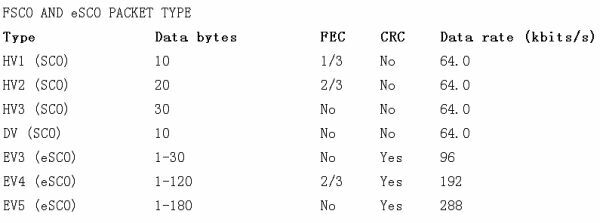 SCO提供了全雙工的音頻。藍牙連接中的主設(shè)備發(fā)送一個數(shù)據(jù)包給從設(shè)備,而從設(shè)備在接下來的時隙中給予響應。盡管能夠?qū)μ囟ǖ陌愋妥鞒鲞x擇,這個特定的包類型還是象征性地被留在了藍牙芯片組內(nèi)的連接管理固件中。藍牙技術(shù)定義了傳輸SCO的四個包類型(見表)。
