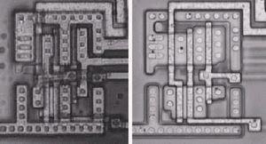 圖2:NAND門驅(qū)動一個反向器的光學(xué)照片(包含金屬層和去掉金屬層)。