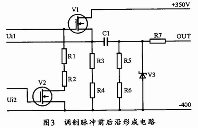 本調(diào)制器的調(diào)制脈沖前后沿形成使用的是BUZ50B,當(dāng)Ui2使得V2導(dǎo)通時,負(fù)偏電壓將使V1迅速截止。這樣形成的調(diào)制脈沖就能夠具有非常良好的后沿波形。其電路圖如圖3所示。