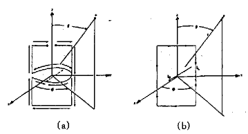 如圖2(a)所示。此處我們選擇螺旋中心為原點(diǎn),螺旋軸為Z軸,頂面和底面上天線臂的平行線為Y軸來建立坐標(biāo)系,另外柱面上的螺旋部分近似用直線和半圓的組合來代替,圖中的實(shí)箭頭表示電流方向,虛箭頭表示圓上電流的矢量和。顯然該模型可更進(jìn)一步簡化為圖2(b)所示的一個(gè)YZ平面上的電流環(huán)和一個(gè)X軸上的電偶極子的組合。同樣跟它垂直的另一付雙臂螺旋天線亦可等效成一個(gè)XZ平面上的電流環(huán)和一個(gè)Y軸上的電偶極子的組合。根據(jù)天線的基本原理,由于這兩組電流環(huán)和電偶極子互相垂直且相差90°,那么在遠(yuǎn)區(qū)得到的是一個(gè)寬波束的心臟形圓極化方向圖。