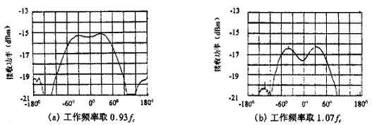其中λC表示中心頻率對應(yīng)的波長。最后得到該天線的實(shí)測結(jié)果如圖3、圖4所示。圖3(a)中的曲線1表示在HP8510B矢量網(wǎng)絡(luò)分析儀上測得的四臂螺旋天線的駐波比特性曲線,為了便于比較,在同樣條件下測得的八臂螺旋天線駐波比由曲線2給出,可見八臂螺旋能明顯地展寬天線的頻帶;圖3(b)表示在相同的儀器上測得的史密斯阻抗圓圖。此處我們根據(jù)要求將天線的頻帶設(shè)計(jì)在14%,而事實(shí)上可以做得更寬。圖4(a)和(b)分別為工作頻率取0.93fc和1.07fc(即圖3(a)中的標(biāo)記2和3)時(shí),由頻譜儀測出的遠(yuǎn)區(qū)輻射方向圖,它們的半功率寬度分別達(dá)到140°以及145°左右,這么寬的波束是其它形式的天線很難達(dá)到的。