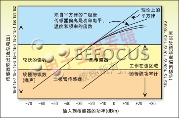 圖2所示為熱電堆單元和二極管檢測(cè)器的響應(yīng)。傳統(tǒng)的二極管檢測(cè)器要么工作在平方律區(qū)域,因此動(dòng)態(tài)范圍被限制為50dB;要么采用線(xiàn)性校正技術(shù)來(lái)擴(kuò)展它們的動(dòng)態(tài)范圍。這種技術(shù)受到功率計(jì)速度的限制,并且不適合于系統(tǒng)傳輸?shù)姆?hào)率遠(yuǎn)遠(yuǎn)超過(guò)功率計(jì)采樣率的應(yīng)用。