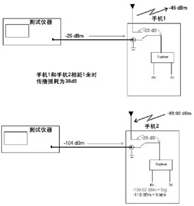 假設(shè)在最壞情況下,手機(jī)1距離手機(jī)2 1米遠(yuǎn)(假定只有遠(yuǎn)場(chǎng)效應(yīng),近場(chǎng)因素很難考慮),將兩個(gè)手機(jī)平行對(duì)準(zhǔn)且手機(jī)之間沒有衰減材料,則手機(jī)2的天線會(huì)收到一個(gè)高達(dá)-83.92dBm的信號(hào)。這樣手機(jī)2的接收器就會(huì)有-103.92dBm干擾信號(hào),因?yàn)榧僭O(shè)天線到過電開關(guān)的衰減為20dB。這個(gè)例子說明了一個(gè)手機(jī)在另一手機(jī)接收信道上產(chǎn)生噪聲的一般原因,根據(jù)例中所做假設(shè),在實(shí)際執(zhí)行中還有很多情況會(huì)引起不同的結(jié)果,這也為認(rèn)識(shí)哪種噪聲會(huì)從一個(gè)手機(jī)進(jìn)入另一個(gè)手機(jī)信道提供了基礎(chǔ)。方位、距離、開關(guān)衰減、屏蔽、天線設(shè)計(jì)和實(shí)現(xiàn)方式等,這些因素都會(huì)在引入噪聲的整個(gè)轉(zhuǎn)換中發(fā)揮作用。